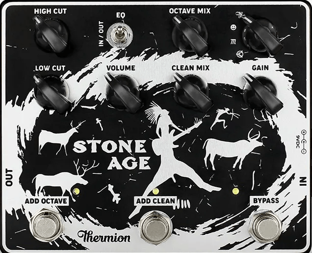The Stone Age is a multi-engine fuzz effects pedal designed to deliver a wide range of classic and modern fuzz tones. It features four selectable fuzz circuits: Single Transistor, Maestro, Face, and a modified Muff circuit (“Thermion”) with enhanced dynamics and clarity. This stompbox offers flexible tone-shaping via a high Q two-band EQ, which can be bypassed for unfiltered fuzz response. Users can blend in clean signal or octaved fuzz, with relay switching and true bypass for transparent integration. Equipped with improved input and output buffers, the Stone Age fuzz pedal is transistor-based and built for versatile signal paths.
