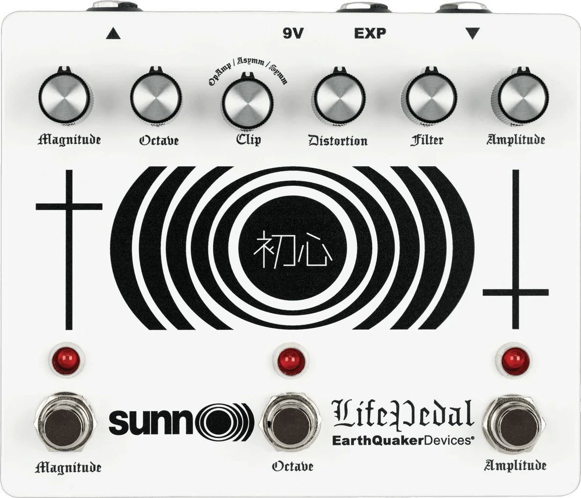 The EarthQuaker Devices Sunn O))) Life Pedal V3 is a multi-function distortion pedal that features classic analog distortion, an adjustable octave-up effect, and a high-output MOSFET boost. The pedal’s distortion circuit builds on the “White Face” distortion design, with three selectable clipping modes: No Diode OpAmp Drive, silicon/LED asymmetrical clipping, and dual silicon diodes. The octave-up circuit is fully analog and its blend can be controlled via a dedicated knob or optional expression pedal. This effect is monophonic and most pronounced on single notes above the 12th fret, while chords introduce complex overtones. The boost section provides a clean MOSFET boost for increased output, without adding additional distortion. The signal path runs from octave to distortion to boost, and each section (distortion/octave, boost) can be activated independently. The pedal features true bypass switching and is equipped with standard 1/4" mono input/output.