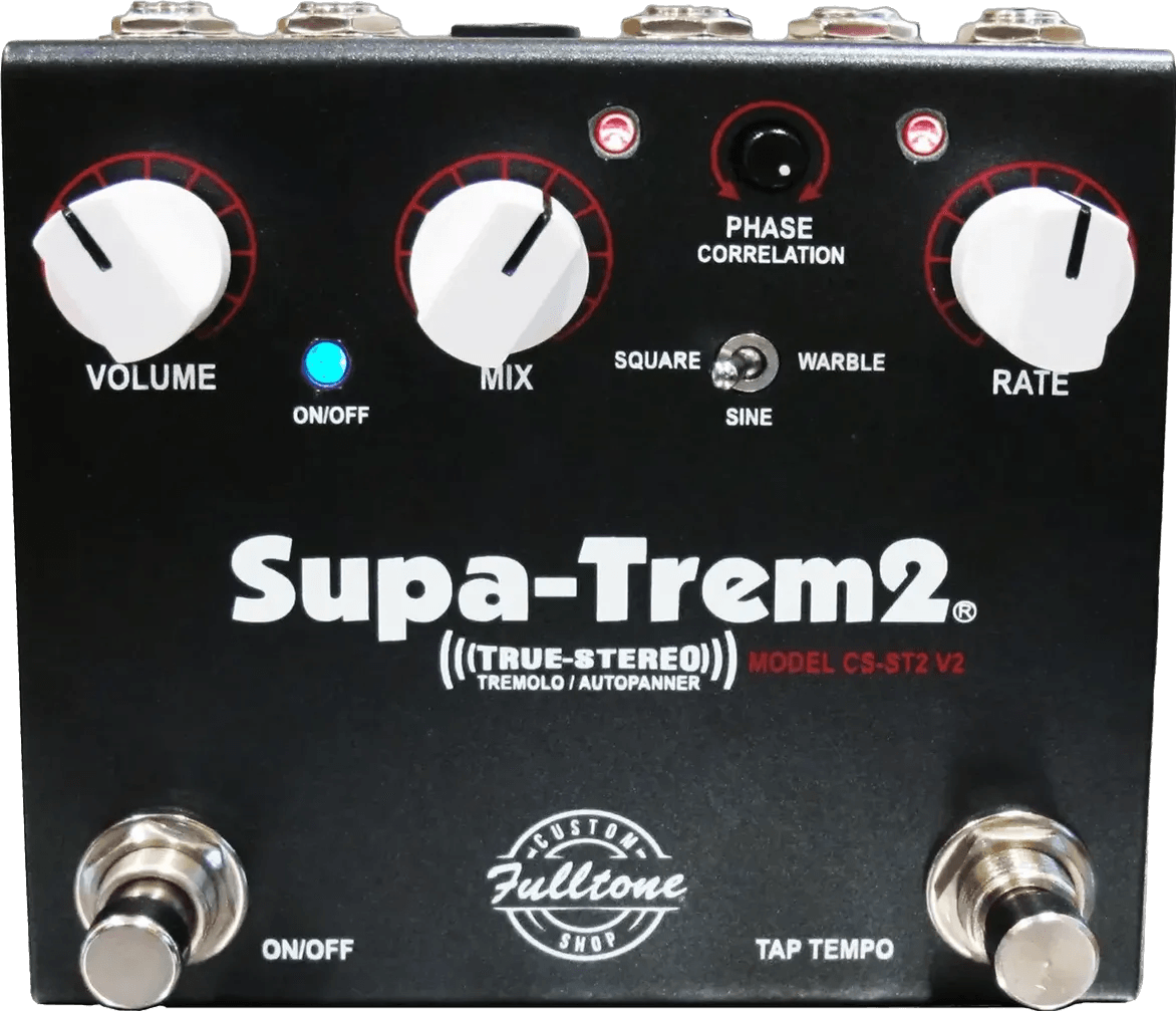 The Fulltone CS-ST2 v2 is a true stereo tremolo effects pedal featuring two independent Supa-Trem circuits with dual inputs and outputs. Unlike designs that only invert output phase, this true-stereo tremolo pedal processes both channels separately for genuine stereo operation. The pedal utilizes high-quality JFET buffered outputs for enhanced bypass performance and low signal loss, supporting long cable runs and amp splitting applications.