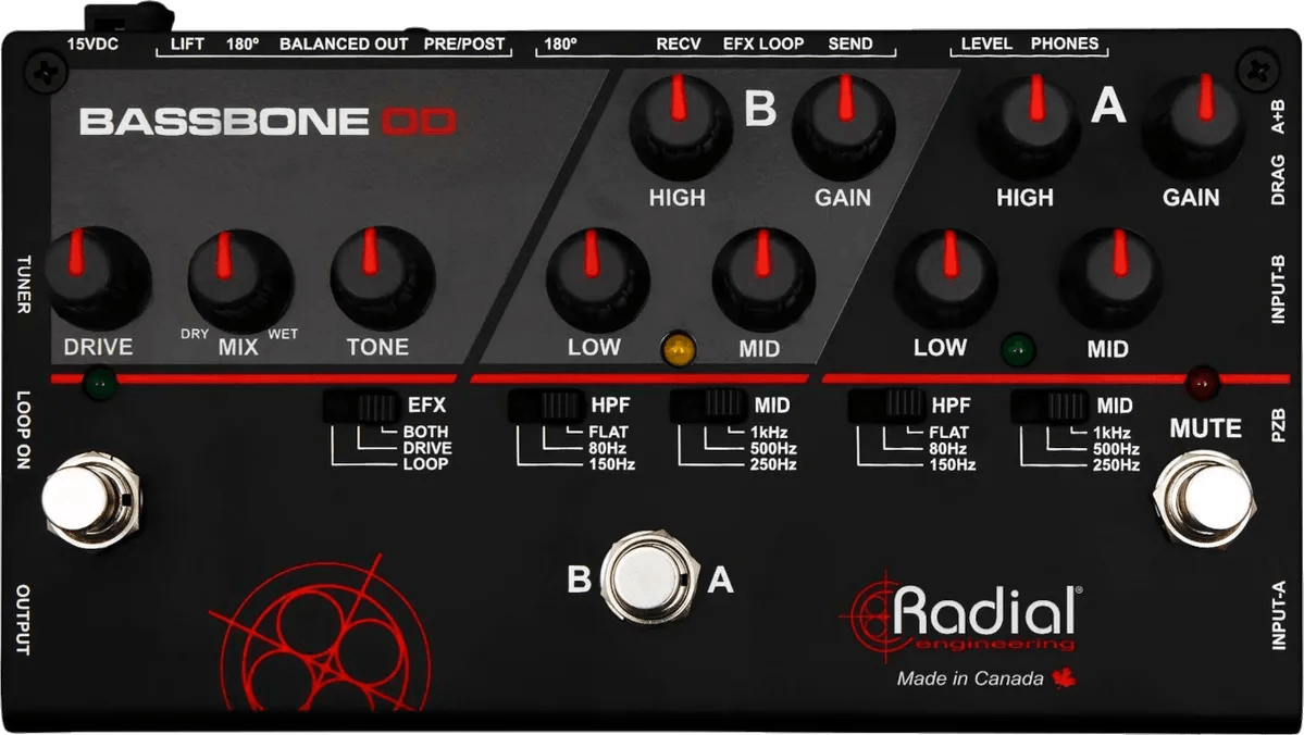 The Radial Engineering Bassbone OD is a two-channel bass preamp pedal designed for versatile instrument signal routing and tone shaping. Each channel features independent volume, EQ, and filter controls, allowing detailed sound optimization and easy switching with the A/B footswitch. The unit also supports simultaneous channel use for instruments with both magnetic and piezo pickups. Integrated effects loop connectivity enables external effects pedals to be engaged full-time, bypassed, or combined with the internal overdrive circuit, providing flexible tonal options. The Bassbone OD is suitable for use with bass instruments.
