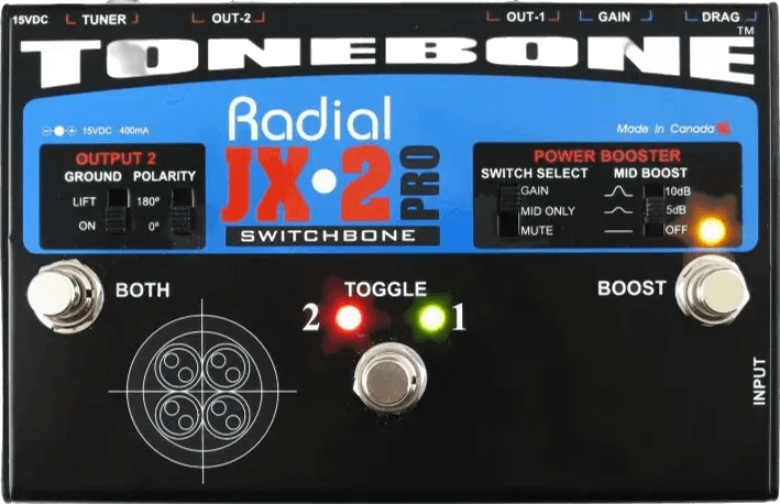 The Radial Switchbone ABY is an ABY switcher pedal designed to route an instrument signal to two amplifiers or signal chains without compromising tone. Utilizing a discrete class-A buffering circuit, this ABY switcher maintains signal integrity and minimizes noise or artifacts. The Switchbone ABY features a Drag™ control load correction, enabling users to restore the natural interaction between the instrument pickups and the amplifier, which is often altered when buffering. This feature also supports longer cable runs (up to 15 meters) while preserving audio fidelity. The circuit construction employs hand-inserted components and a double-sided through-hole PCB for optimal signal transfer.