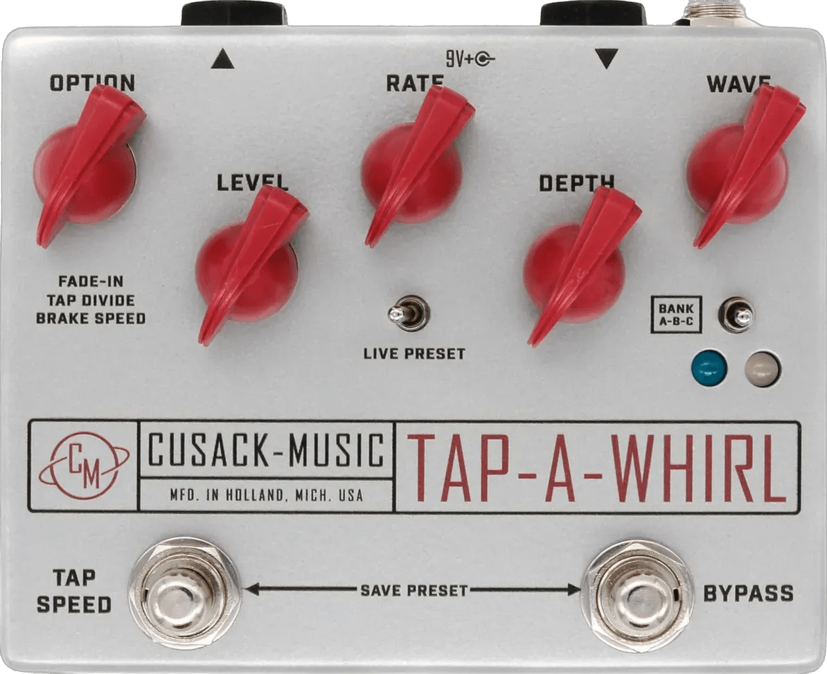 The Cusack Music Tap-A-Whirl is an analog tremolo pedal equipped with built-in tap tempo functionality. Designed for versatile sound design, this stereo tremolo effect pedal features 24 selectable waveforms, including sine, ramp, square, blip, bleep, waver, echo, and ping pong. The footswitch allows users to set the tempo using tap tempo, and a dedicated tap jack is included for external control. Stereo output provides a wide spatial tremolo effect for expansive audio processing.