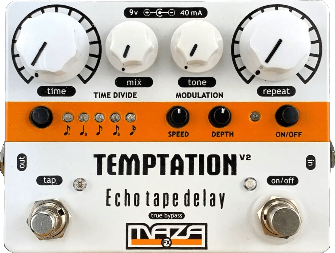 The Maza FX Temptation Echo is an analog tape delay effects pedal designed to replicate classic tape echo sounds. Using digitally controlled analog circuitry, this delay pedal provides flexible tonal options while maintaining authentic analog signal processing. The Temptation Echo offers adjustable parameters for recreating vintage tape delay textures, with dedicated controls allowing musicians to shape delay times and repeats. This unit combines modern control with traditional tape delay characteristics.