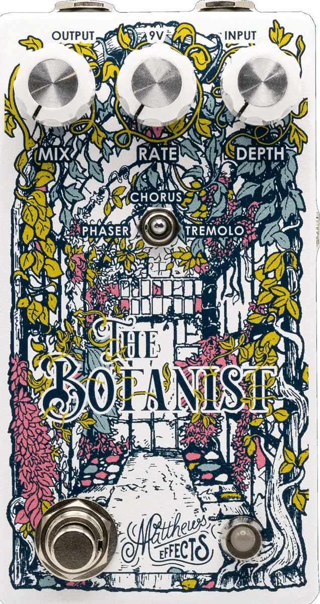 The Botanist by [Brand] is a multi-algorithm modulation effects pedal featuring three modulation types: phaser, chorus, and harmonic tremolo. This pedal offers multiple sound-shaping options with user-selectable algorithms and integrates digital flexibility with MIDI control support. Six onboard preset slots allow access to a range of saved settings. Additional features include a Hold function for creative effects and compact enclosure design for efficient pedalboard placement.