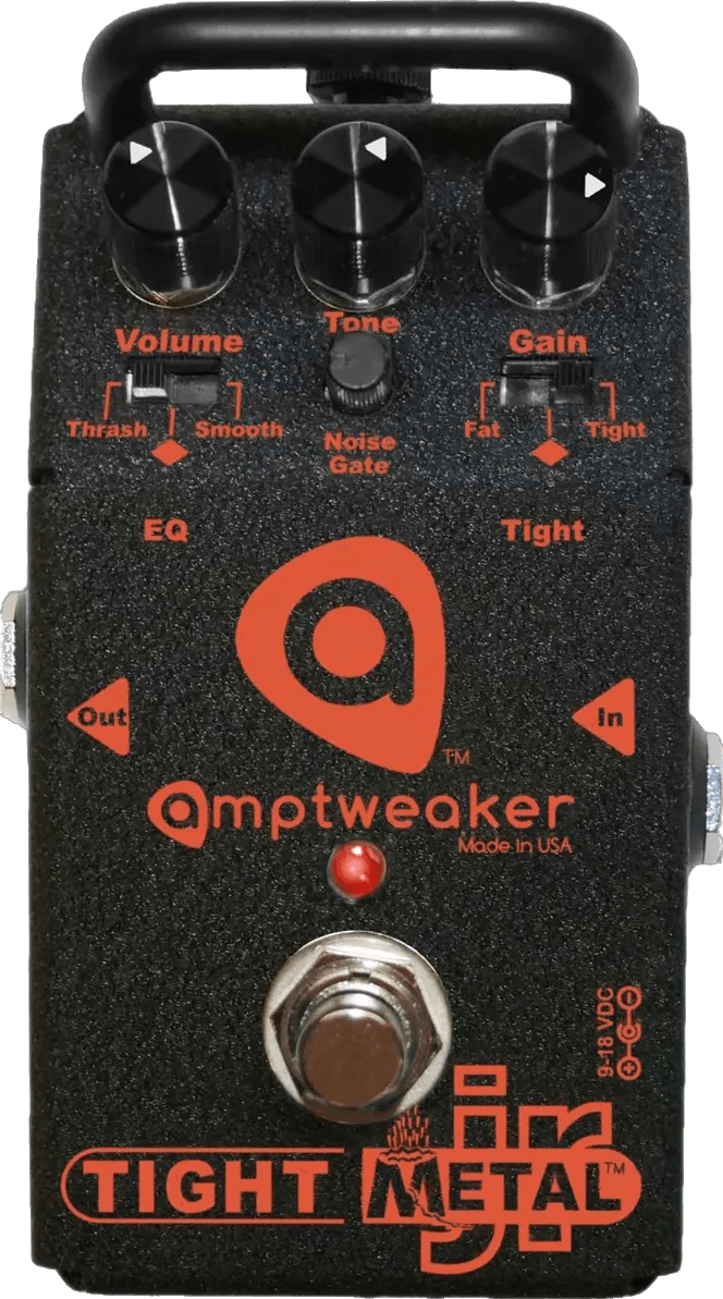 The Amptweaker Bass TightMetal Jr is a bass distortion effects pedal designed for low-end clarity and control. It features a side-mounted Dry Low MOD knob for blending clean low frequencies with distortion, preserving bass fundamentals without phase issues. The pedal includes a three-way Fat/Normal/Tight switch to select note attack characteristics, and an EQ switch with Thrash, Normal, and Smooth voicings for expanded tonal flexibility. Standard controls include Gain, Tone, and Volume, along with an adjustable noise gate for managing unwanted noise. The Tight control and Tone circuit are optimized for bass and extended range instruments, ensuring response at lower frequencies.