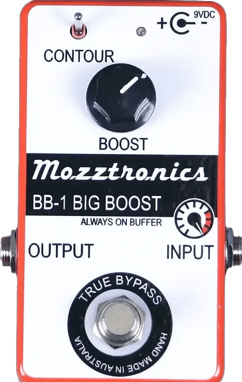 The Mozztronics BB-1 Big Boost is a clean boost effects pedal designed to provide up to 27dB of adjustable gain. Featuring a single BOOST control, this pedal allows users to set the desired amount of output boost, ranging from 0dB up to 27dB. The CONTOUR switch offers two tonal options: a full-range boost or a setting with a subtle bass cut at approximately 160Hz. Incorporating class G amplifier technology, the BB-1 is engineered for high headroom and clean output. An always-on buffer ensures signal integrity in any rig position, helping maintain tone through long cable runs or when placed at the beginning of a pedal chain.