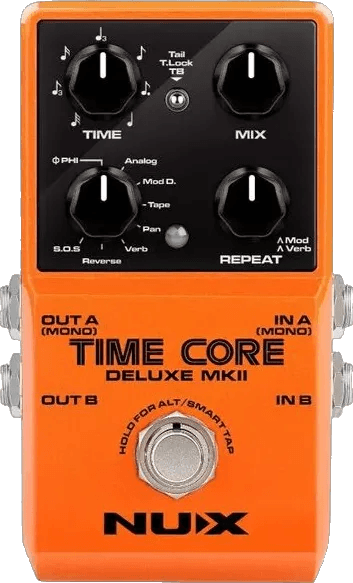 The NUX Time Core Deluxe MKII is a digital delay effects pedal designed for a wide range of time-based effects. This unit offers seven selectable delay types—ΦPhi Digital Delay, Analog Delay, Modulation Delay, Tape Echo, Pan Delay, Verb Delay, and Reverse Delay—accessible via a rotary type selector. A built-in phrase looper enables sound-on-sound layering. The pedal supports both standard mono and stereo operation and includes tap tempo functionality for convenient control over delay timing.