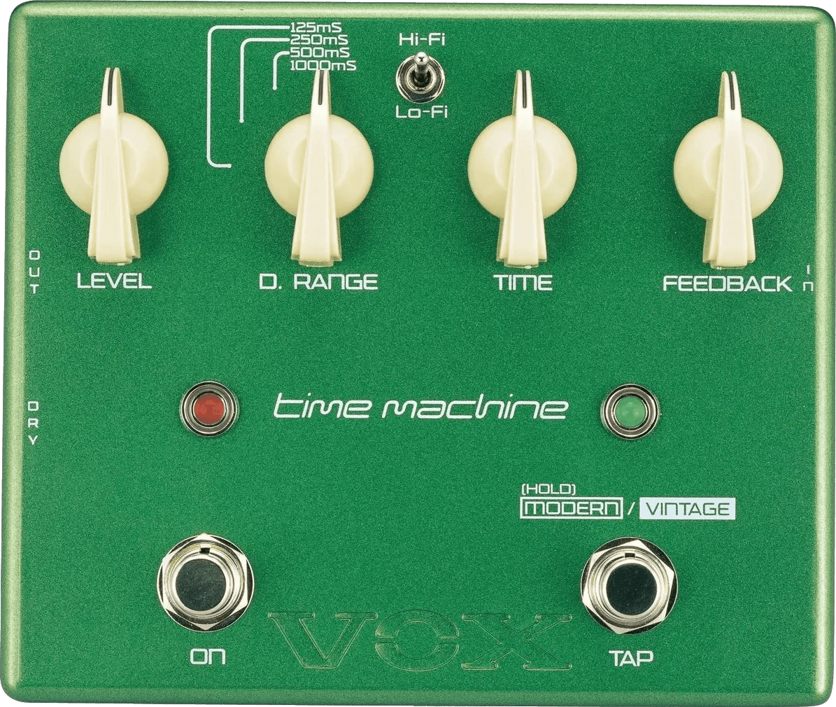 The VOX Time Machine delay pedal is a dual-mode delay effects pedal designed in collaboration with Joe Satriani. This analog/digital delay pedal features two distinct delay modes and a dedicated Hi-Fi/Lo-Fi switch for varied tonal textures. The simple interface offers a range of delay sounds, making it a versatile option for musicians seeking both modern and vintage delay effects. The pedal is equipped with intuitive control knobs for easy adjustment of delay time, feedback, and effect level.